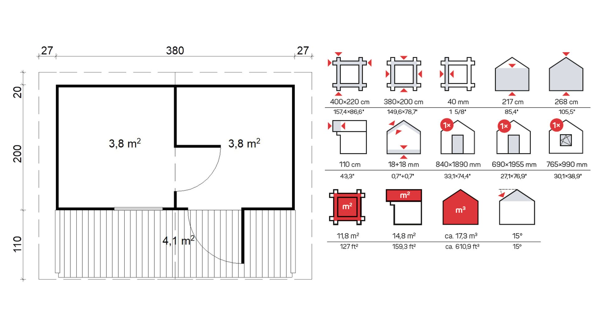 Dimenzije zidova (širina x dužina): 380 x 200 cm + 110 cm